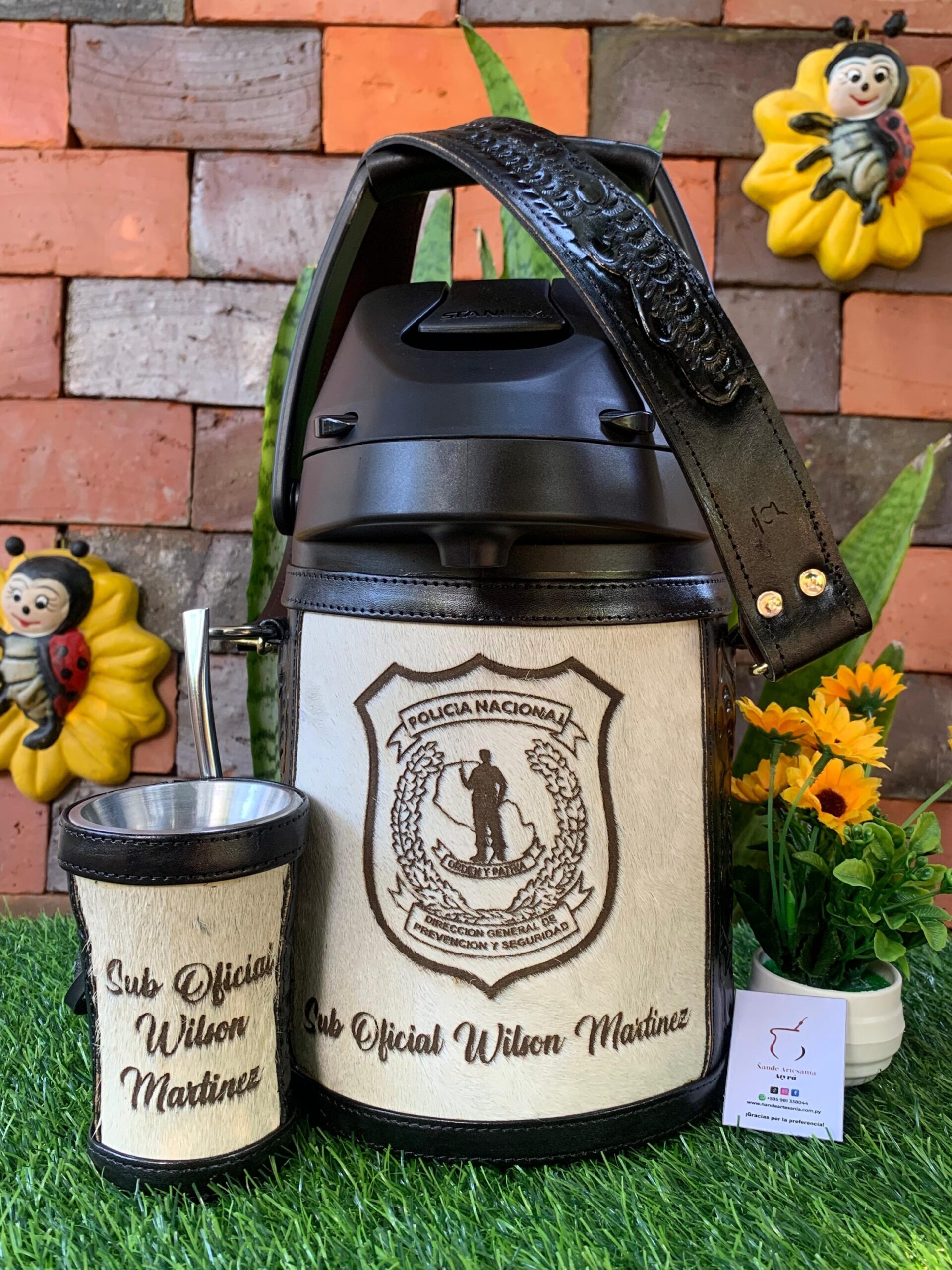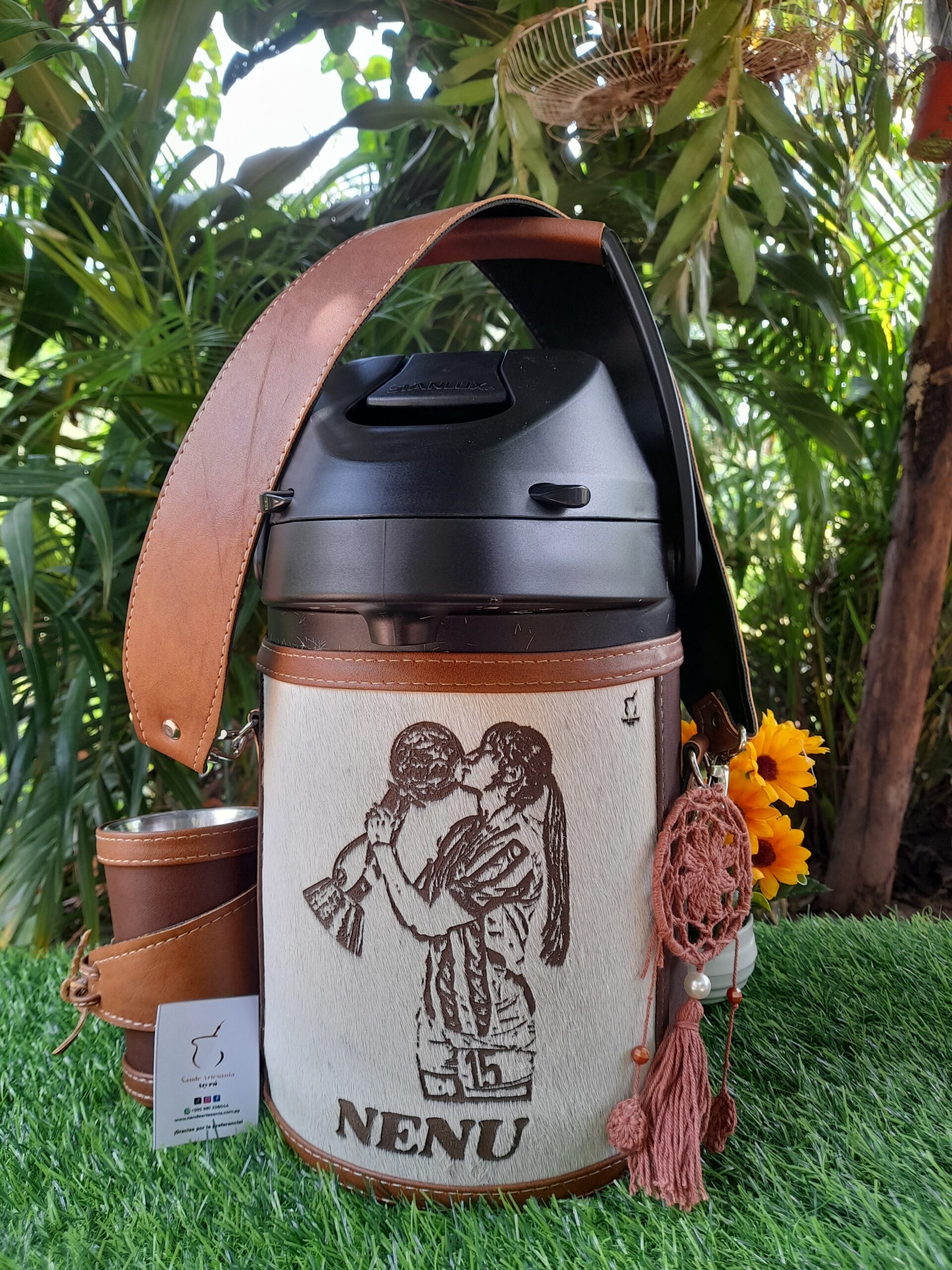 Termo 2.5 litros y guampa Revestido medio forro en cuero , personalizado